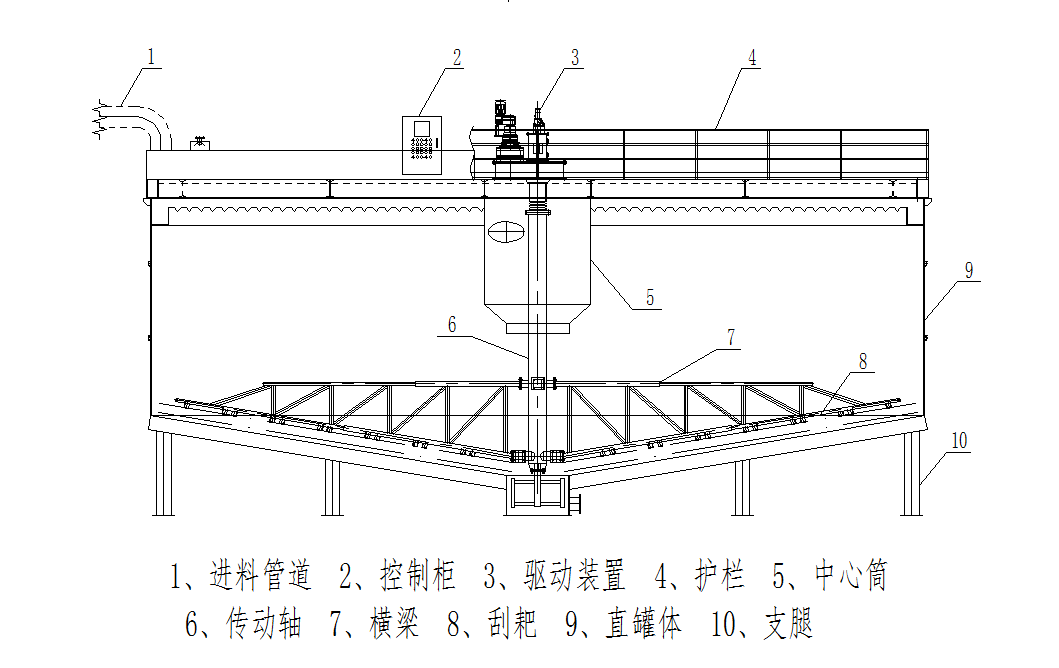 濃密機是基于重力沉降的固液分離設備,將礦漿與絮凝劑混合之后,通過中心筒進入到濃密機,由進料豎筒出口端的導流板,把礦漿從進料豎筒引向四周,使礦漿向四周擴散。可將含固量為10%-20%的礦漿通過重力沉降濃縮為含固量為45%-55%的底流礦漿,借助安裝在濃密機內的耙機的作用,使增稠的底流礦漿由濃密機底流口排出。上層清水從頂部排水口排出,從而達到泥水分離作用。