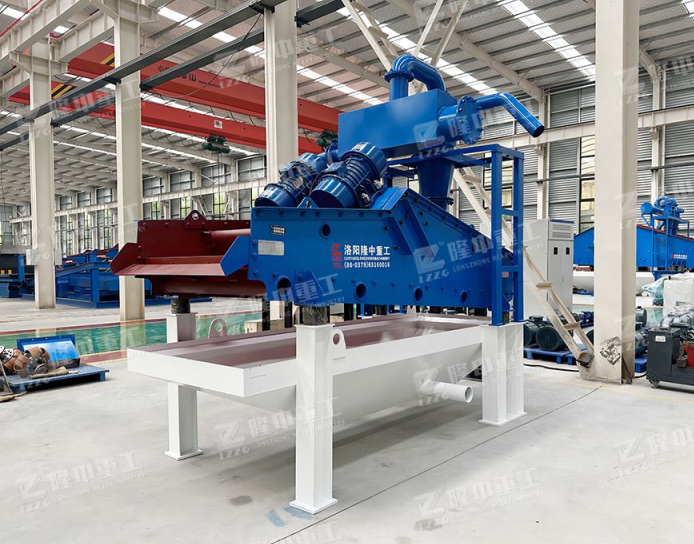 回收部分:而洗砂機溢流的洗砂廢水則進入到該設備清洗箱中,經由底部真空高壓泵抽至旋流器中進行分級濃縮,通過高速離心力和額定的入料壓力,旋流器將洗砂廢水中的細沙與水分離,而后將濃度被提升至60-70%的細沙通過沉沙嘴排入振動脫水篩表面,在高頻振動電機的帶動下,實現細沙的脫水回收,而其他的廢水、泥、粉等雜質則通過旋流器溢流口進入返水箱排出。