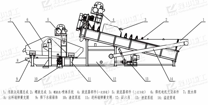 螺旋洗砂裝置,溢流裝置、反水裝置,尾礦干排裝置,分離回收裝置,儲水槽,水泵,電機,減速機。
