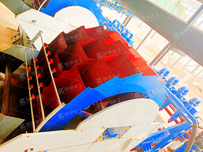 當電動機、減速機啟動后,減速機可驅動水槽中的葉輪不停的在水槽中作圓周運動,水槽中的砂石或者石粉經過葉輪的的攪拌、翻轉,被葉輪帶到高處脫水后排入出料槽進行后續烘干等操作,可得到我們需要的符合標準的砂石產品。